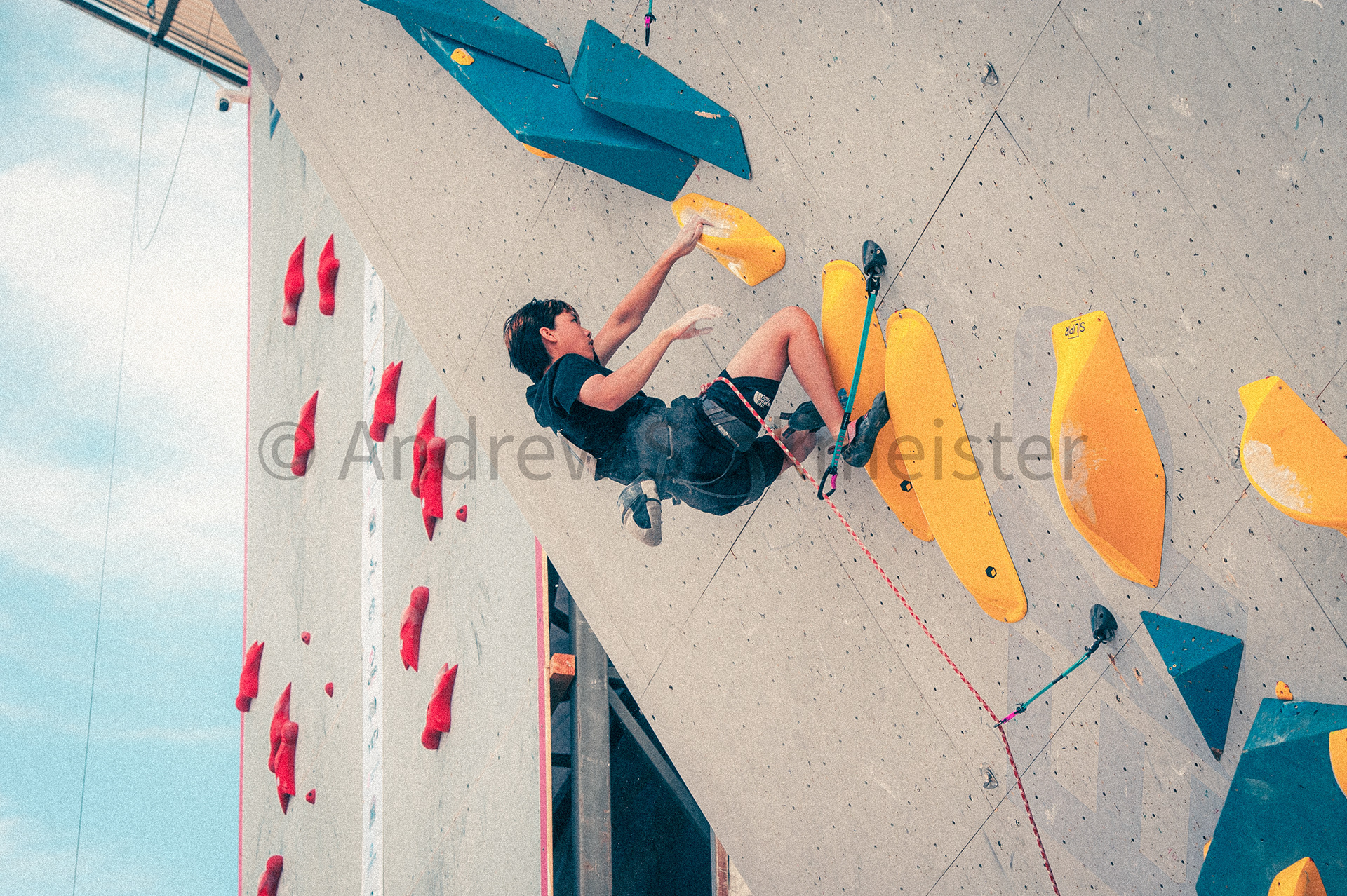 This project was made possible and exists entirely because of USA climbing and their willingness to gift me with a media pass to this event. Beyond that, my mission was exclusively to capture the effort and mental state of the climbers on the wall. Sometimes that meant sacrificing the direct ability to see a face so that the positioning of the climber's body told the story, and other times the action and effort on the climber's face was the main objective. The women's side of this competition was extremely special to me for the number of amazing people I had the privilege of meeting. Among these people were Karson Hilgert (pictured left), Natalia Grossman (Olympian and eventual winner, pictured below), and Annie Sanders (not competing, but supporting Natalia and others). The women were also the first people I got to see climb, and I truly was blown away be the level of skill and execution they demonstrated from the start. These were also ideas that stuck in the back of my head and inspired my efforts for the rest of the competition.